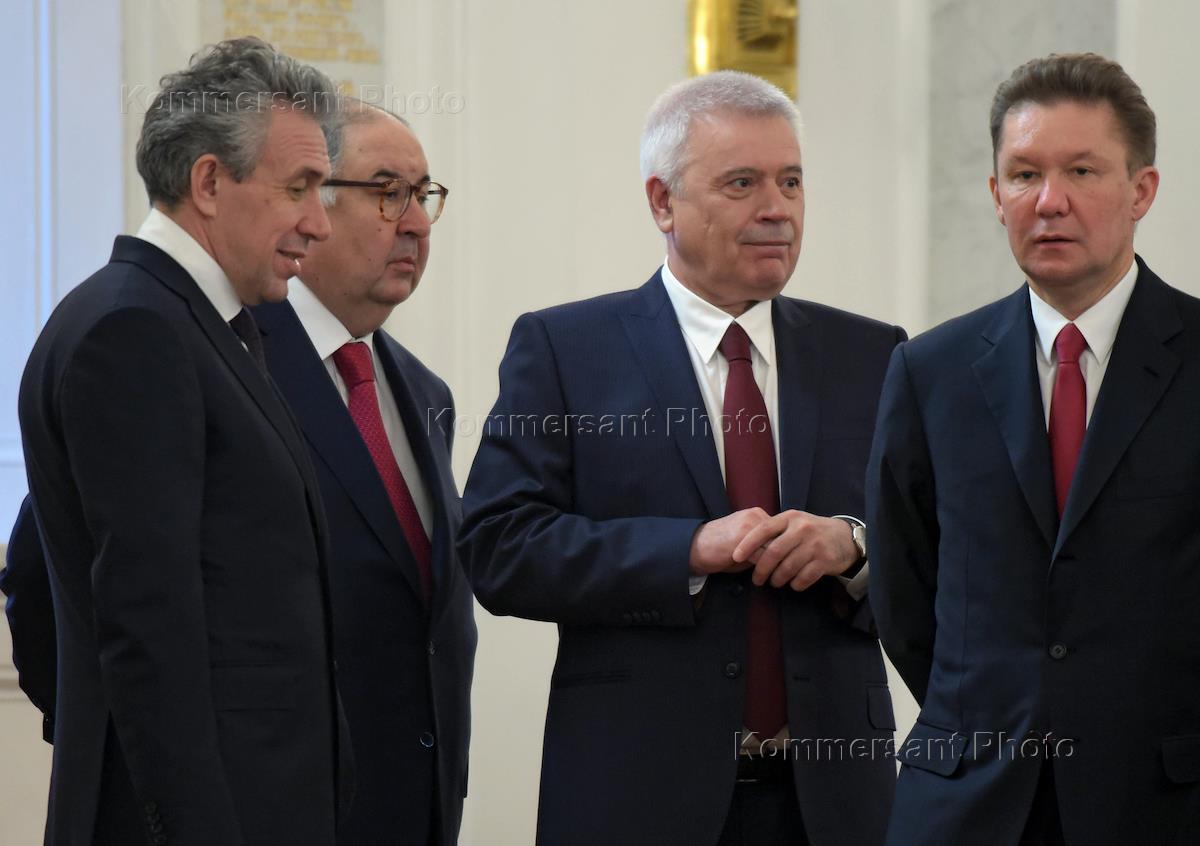 Встреча президента России Владимира Путина с президентом Узбекистана Шавкатом Мирзиёевым. Церемония подписания совместных договоров в рамках российско-узбекских переговоров. Слева направо: председатель Внешэкономбанка Сергей Горьков, основатель USM Holdings Алишер Усманов, президент нефтяной компании "ЛУКойл" Вагит Алекперов и председатель правления компании "Газпром" Алексей Миллер перед началом встречи.