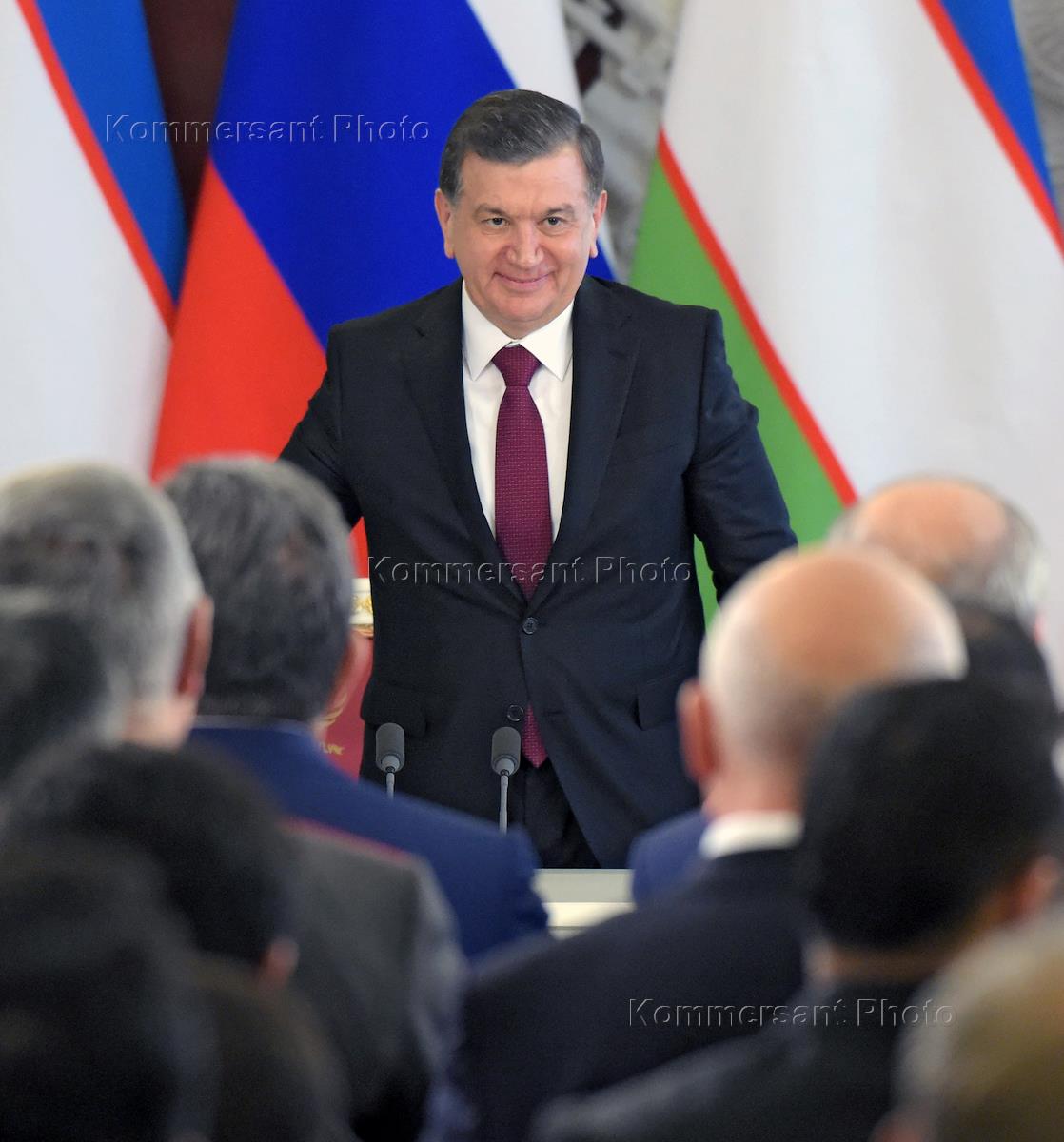 Встреча президента России Владимира Путина с президентом Узбекистана Шавкатом Мирзиёевым. Президент Узбекистана Шавкат Мирзиёев (в центре) во время российско-узбекских переговоров.
