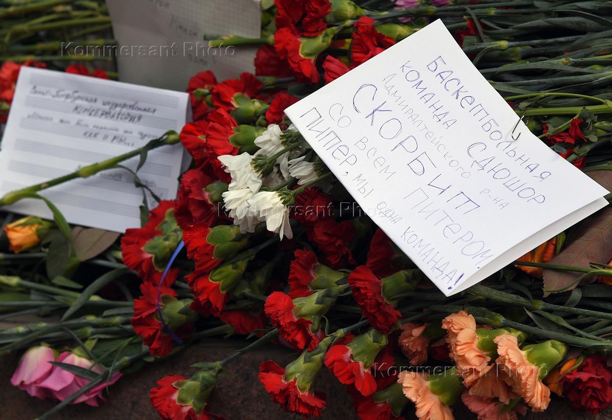People bring flowers to the Tekhnologichesky Institut subway station to commemorate victims of bombing during a three-day mourning.