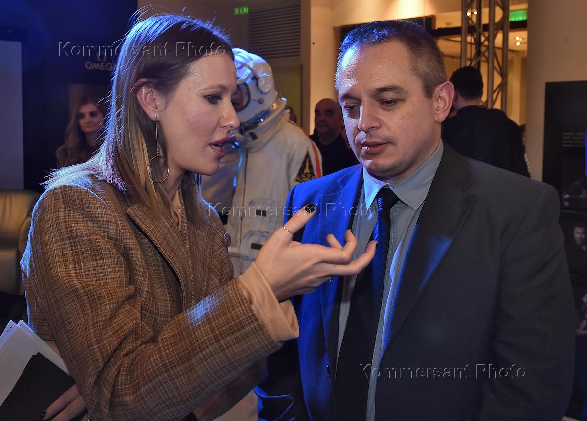 Закрытый показ фильма "Время первых", организованный компанией Omega в честь 60-летия хронометров Speedmaster, в галерее "Времена года". Телеведущая, главный редактор русской версии журнала L'Officiel Ксения Собчак (слева) и начальник отдела РКК "Энергия" Марк Серов (справа) на закрытом показе.