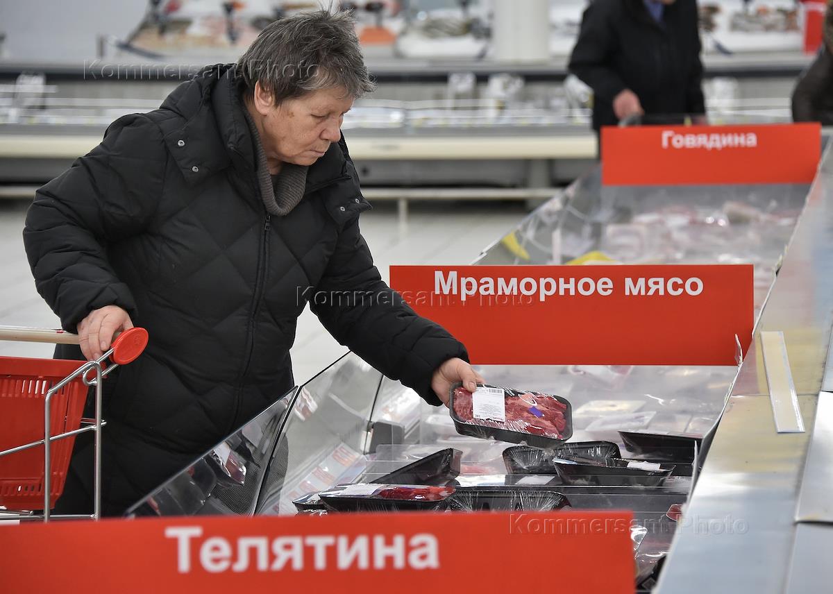 A customer unloads items at a cash register at Auchan hypermarket store.