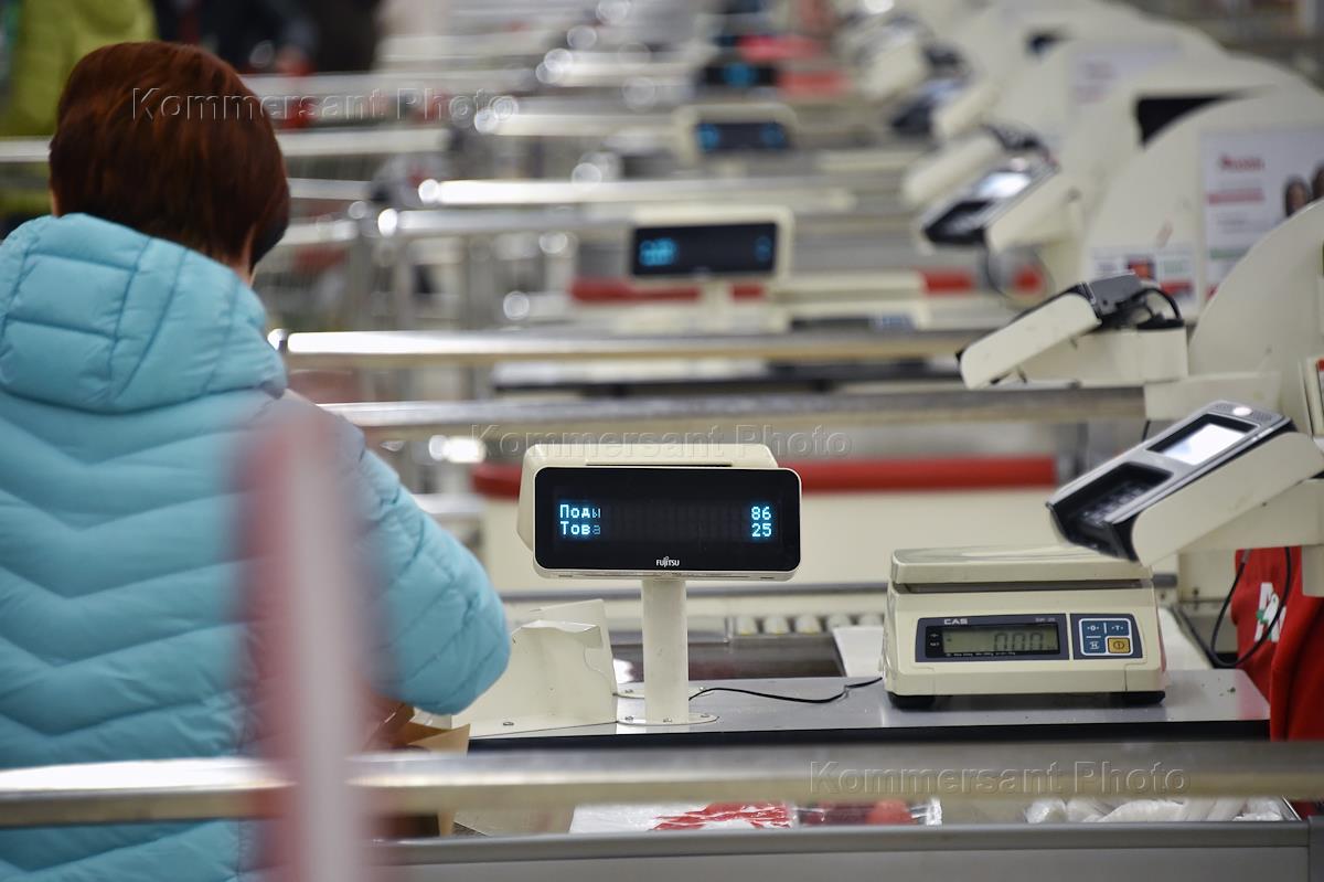 Customers pay for purchase at a cash register of Auchan hypermarket store.