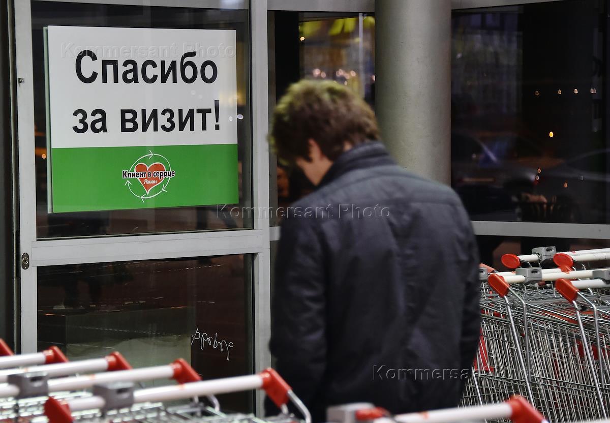 Гипермаркет "Ашан". Покупатели на входе в торговый зал.