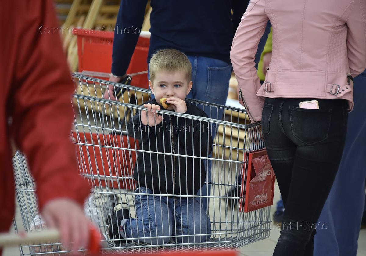 A girl sits at the shopping trolley at Auchan hypermarket store.