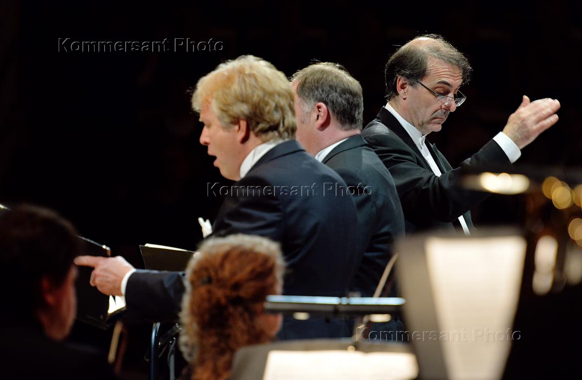 Концерт Московского камерного оркестра Musica viva и хора Kantorei der Schlosskirche под управлением дирижера Александра Рудина "Мендельсон. Оратория "Павел" для солистов, хора и оркестра" в Концертном зале имени П.И.Чайковского. Слева направо: художественнй руководитель Московского камерного оркестра Musica Viva Александр Рудин, оперные певцы Манфред Биттнер и Маркус Шафер во время концерта.