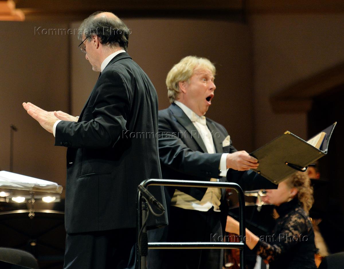 Концерт Московского камерного оркестра Musica viva и хора Kantorei der Schlosskirche под управлением дирижера Александра Рудина "Мендельсон. Оратория "Павел" для солистов, хора и оркестра" в Концертном зале имени П.И.Чайковского. Хдожественнй руководитель Московского камерного оркестра Musica Viva Александр Рудин (слева) и оперный певей Манфред Биттнер (справа) во время концерта.