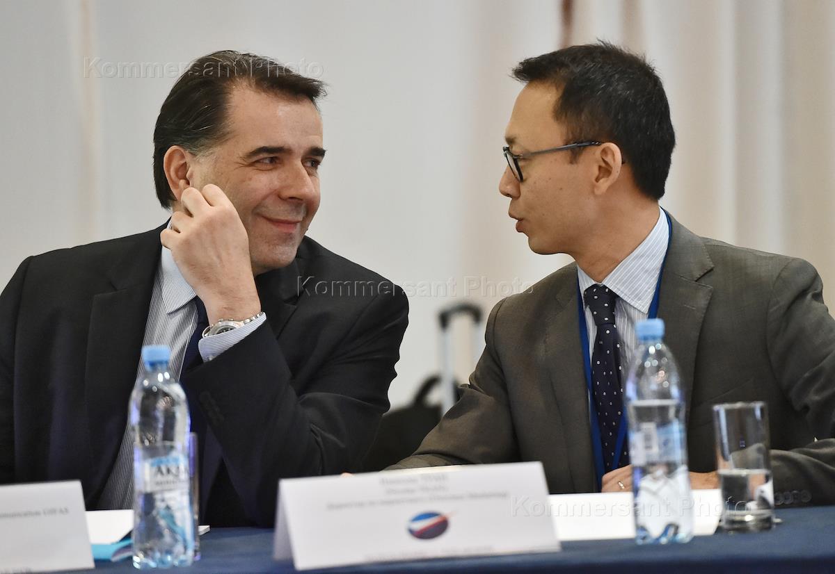 Пресс-конференция 52-го Международного авиакосмического салона в Ле Бурже в посольстве Франции. Директор по комуникациям Международного авиакосмического салона в Ле Бурже Кристофер Робан (слева) и директор по маркетингу Международного авиакосмического салона в Ле Бурже Никола Тран (справа) во время пресс-конференции.