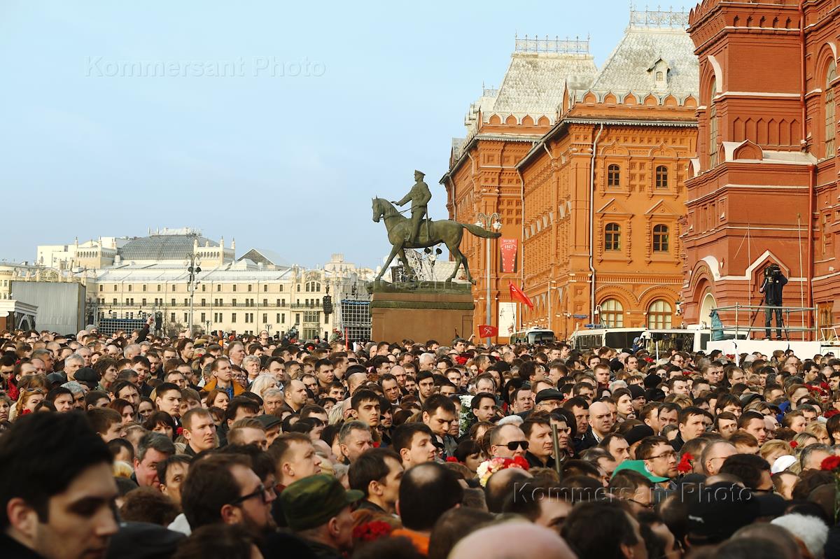 People hold a rally to commemorate victims of bombing on Saint Petersburg metro in Manezhnaya Square.