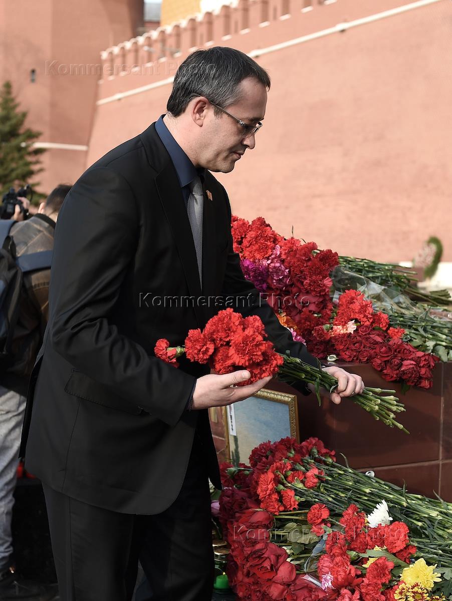 Акция в память о жертвах теракта в метро Санкт-Петербурга "Питер, мы с тобой" прошла на Манежной площади. Председатель Московской городской думы Алексей Шапошников во время возложения цветов к стелле "Ленинград" в Александровском саду.