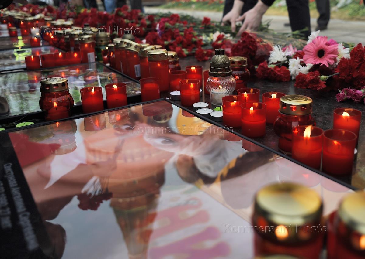 Акция в память о жертвах теракта в метро Санкт-Петербурга "Питер, мы с тобой" прошла на Манежной площади. Цветы у стеллы "Ленинград" в Александровском саду.
