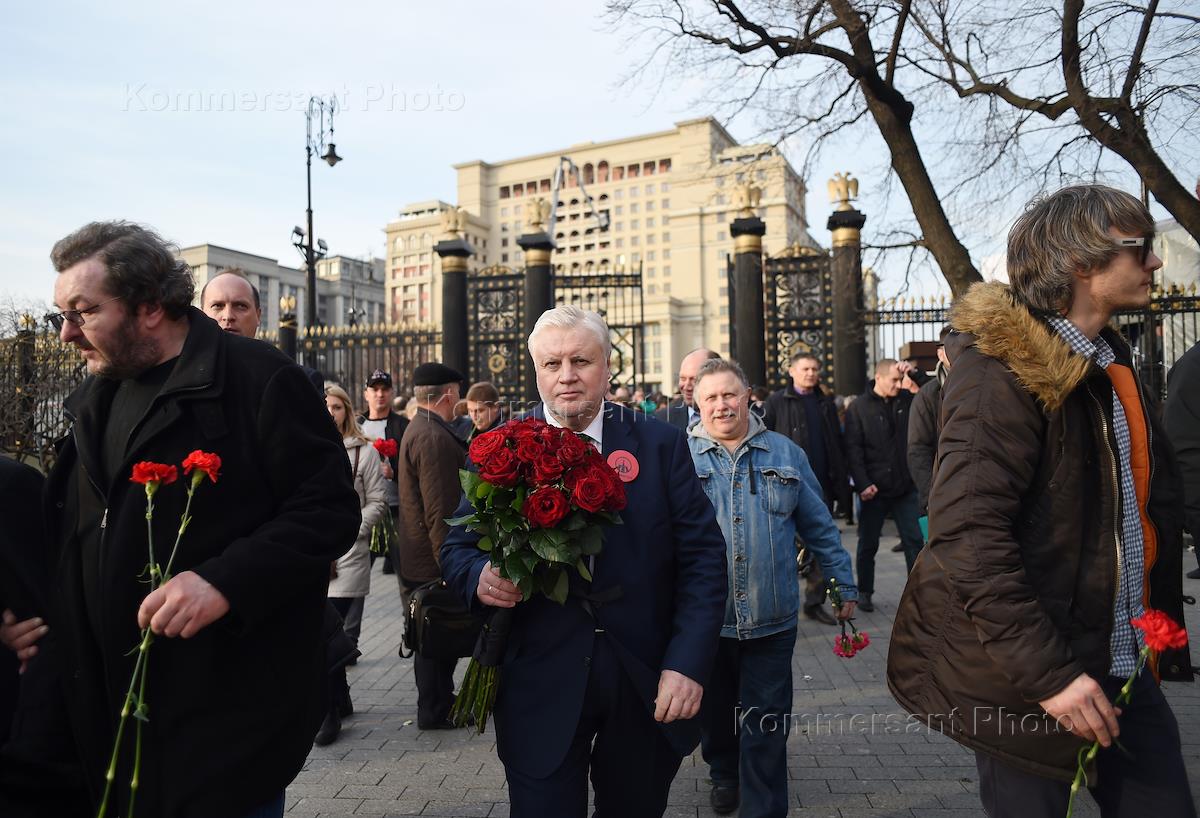 Акция в память о жертвах теракта в метро Санкт-Петербурга "Питер, мы с тобой" прошла на Манежной площади. Лидер партии "Справедливая России" Сергей Миронов (в центре) во время возложения цветов у стелле "Ленинград" в Александровском саду.