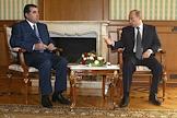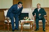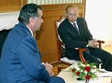 Президент Таджикистана Эмомали Рахмонов (слева) во время встречи с Президентом России Владимиром Путиным (справа). Встреча состоялась в резиденции Президента России "Бочаров ручей".