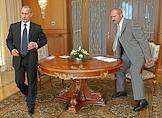 Президент России Владимир Путин (слева) во время встречи с президентом Белоруссии Александром Лукашенко (справа). Встреча состоялась в резиденции Президента России "Бочаров ручей".