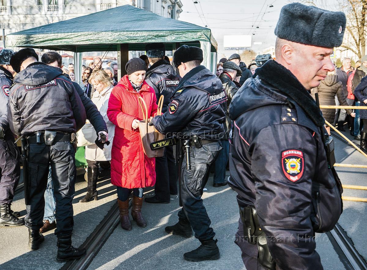 Акция в память о жертвах теракта в метро Санкт-Петербурга на Технологической площади у станции метро "Технологической институт". Сотрудники полиции во время досмотра участников акции перед началом.