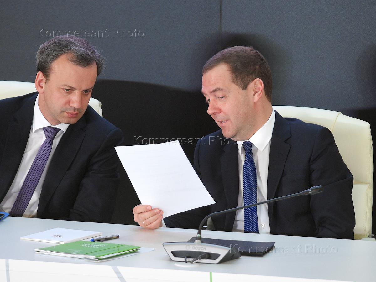 Итоговая коллегия Министерства сельского хозяйства РФ "Об итогах реализации в 2016 году госпрограммы развития сельского хозяйства и регулирования рынков сельхозпродукции, сырья и продовольствия на 2013-2020". Заместитель председателя правительства России Аркадий Дворкович (слева) и председатель правительства России Дмитрий Меведев (справа) во время работы коллегии.