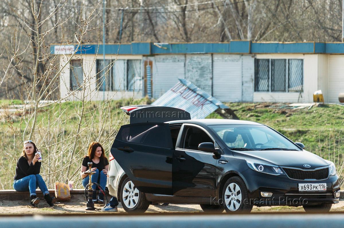 Жанровая фотография. Девушки возле машины во время курения кальяна.