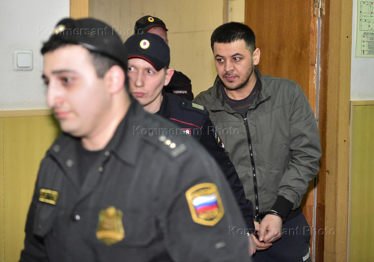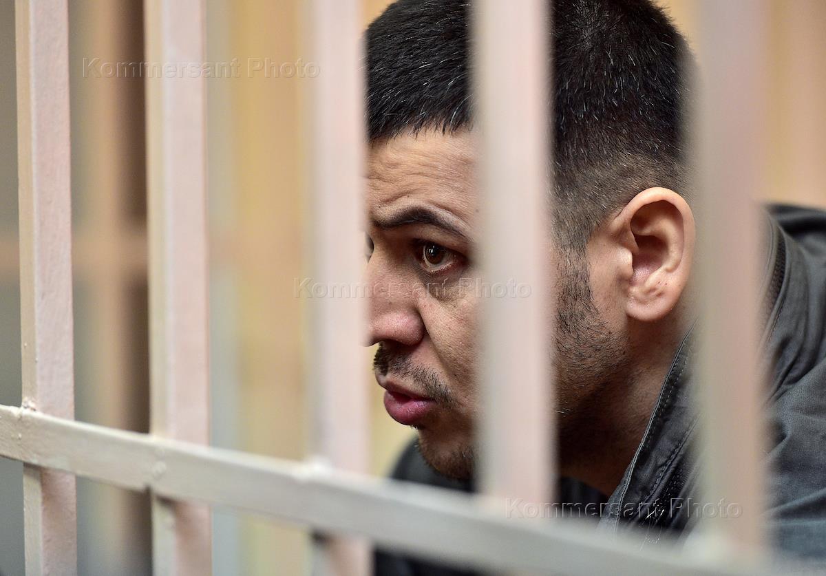 Гражданин Таджикистана Содик Ортиков (справа), подозреваемый в причастности к теракту в метрополитене Санкт-Петербурга 3 апреля, перед рассмотрением ходатайства об избрании меры пресечения в Басманном суде.