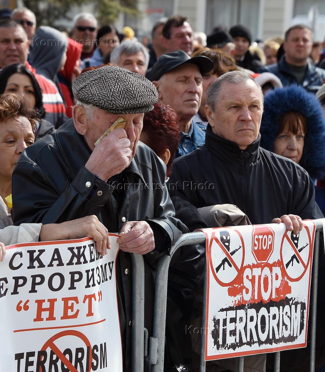Crimea residents gather to protest against terrorism in response to the bombing on Saint Petersburg metro.