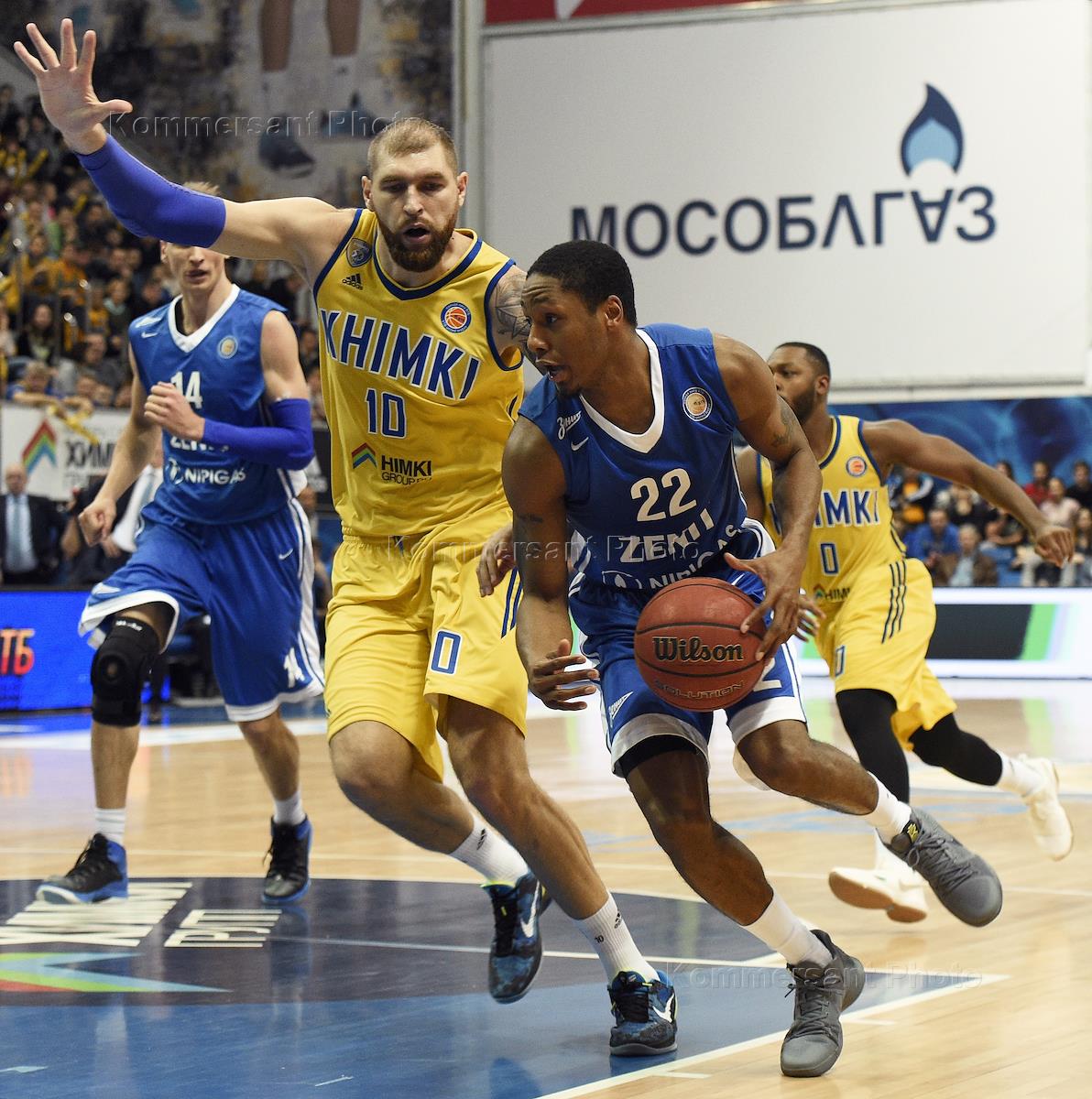 Единая лига ВТБ по баскетболу. Матч между командами "Химки" (Химки) и "Зенит" (Санкт-Петербург) в Баскетбольном центре "Химки". Игрок команды "Химки" Алексей Швед (слева) и игрок команды "Зенит" Тревор Мбакве (в центре) во время матча.