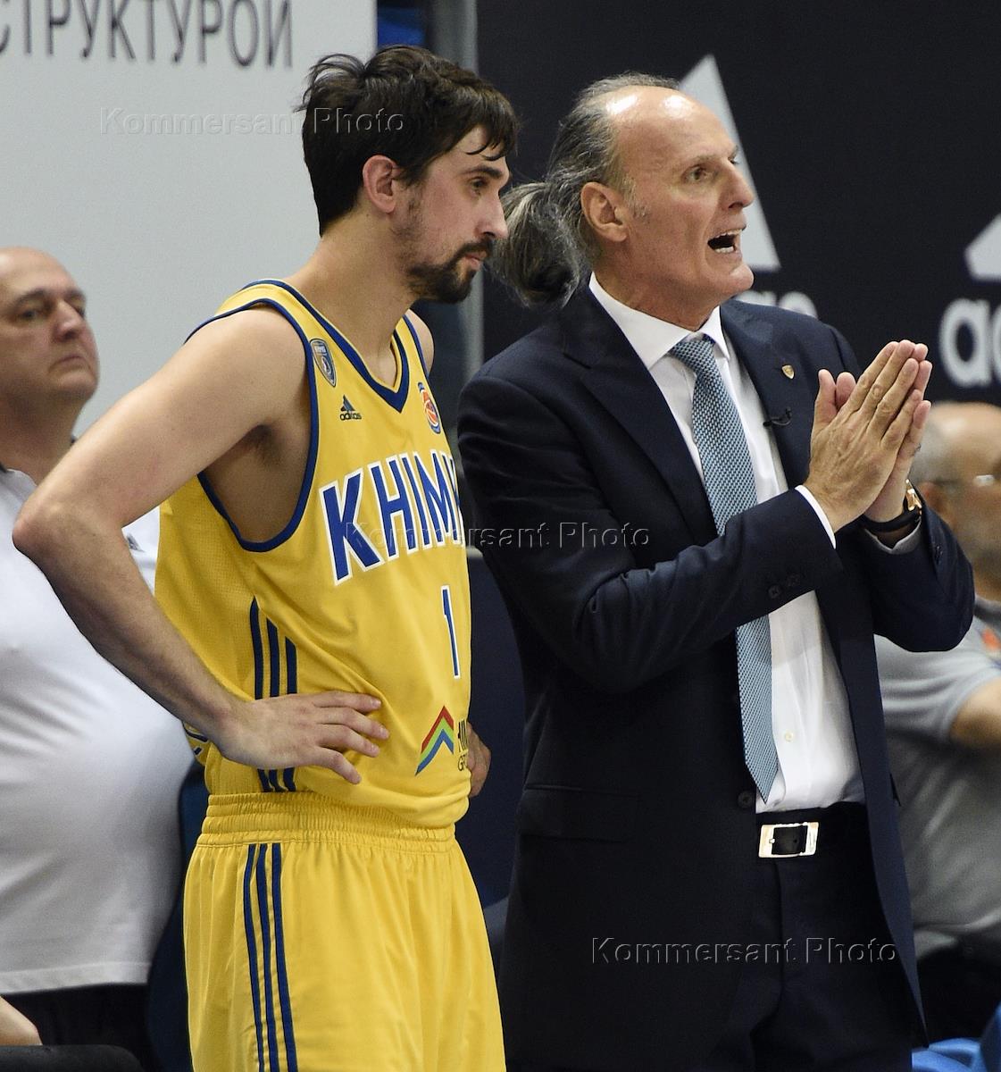 Единая лига ВТБ по баскетболу. Матч между командами "Химки" (Химки) и "Зенит" (Санкт-Петербург) в Баскетбольном центре "Химки". Главный тренер команды "Химки" Душко Иванович (справа) и игрок его команды Алексей Швед (слева) во время матча.