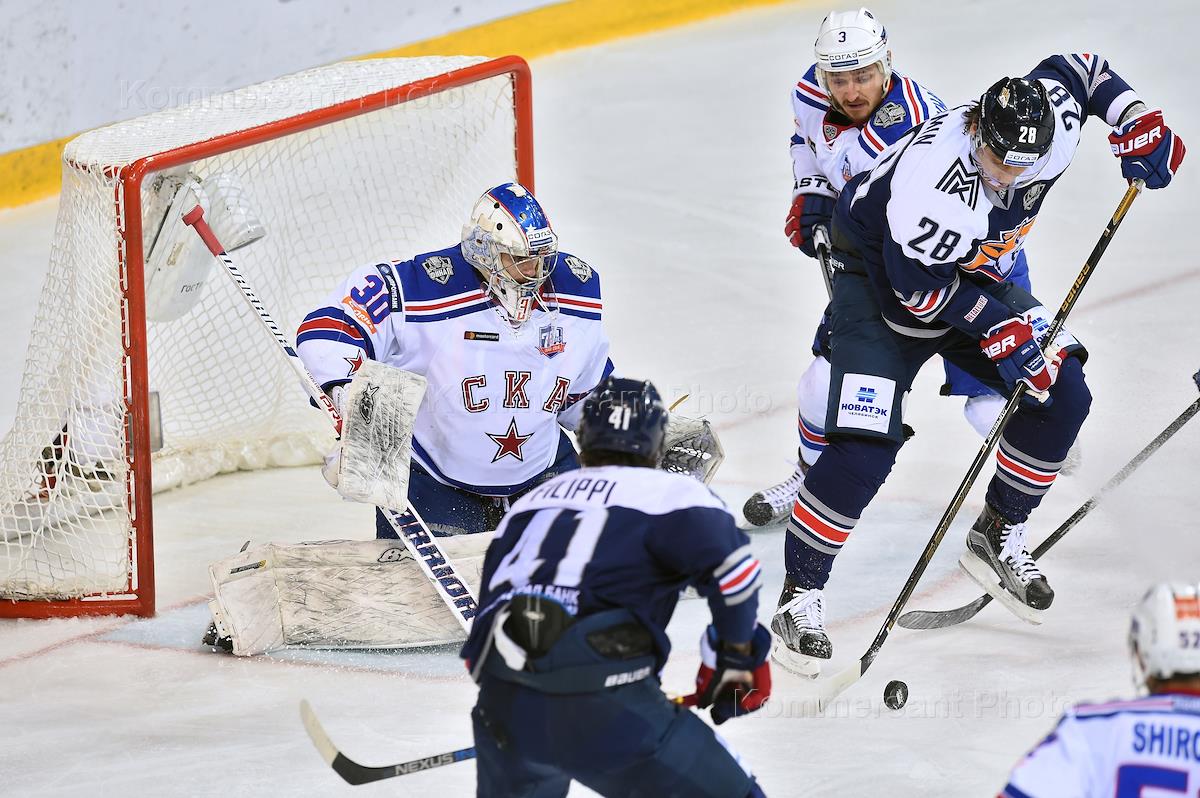 Континентальная хоккейная лига (КХЛ). Кубок Гагарина. Финал. Матч между командами "Металлург" (Магнитогорск) и СКА (Санкт-Петербург) на стадионе "Арена-Металлург". Игроки команды "Металлург" Томаш Филиппи (второй слева), Александр Семин (справа), игроки команды СКА Игорь Шестеркин (слева) и Динар Хафизуллин (второй справа) во время матча.