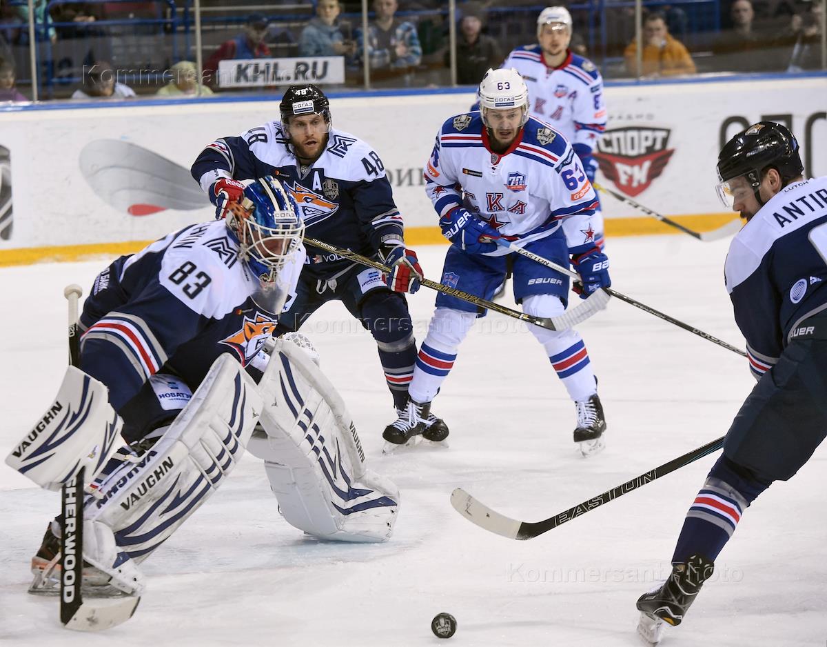 Континентальная хоккейная лига (КХЛ). Кубок Гагарина. Финал. Матч между командами "Металлург" (Магнитогорск) и СКА (Санкт-Петербург) на стадионе "Арена-Металлург". Игроки команды "Металлург" Ярослав Косов (в центре), Виктор Антипин (справа) и игрок команды СКА Никита Гусев (слева) во время матча.