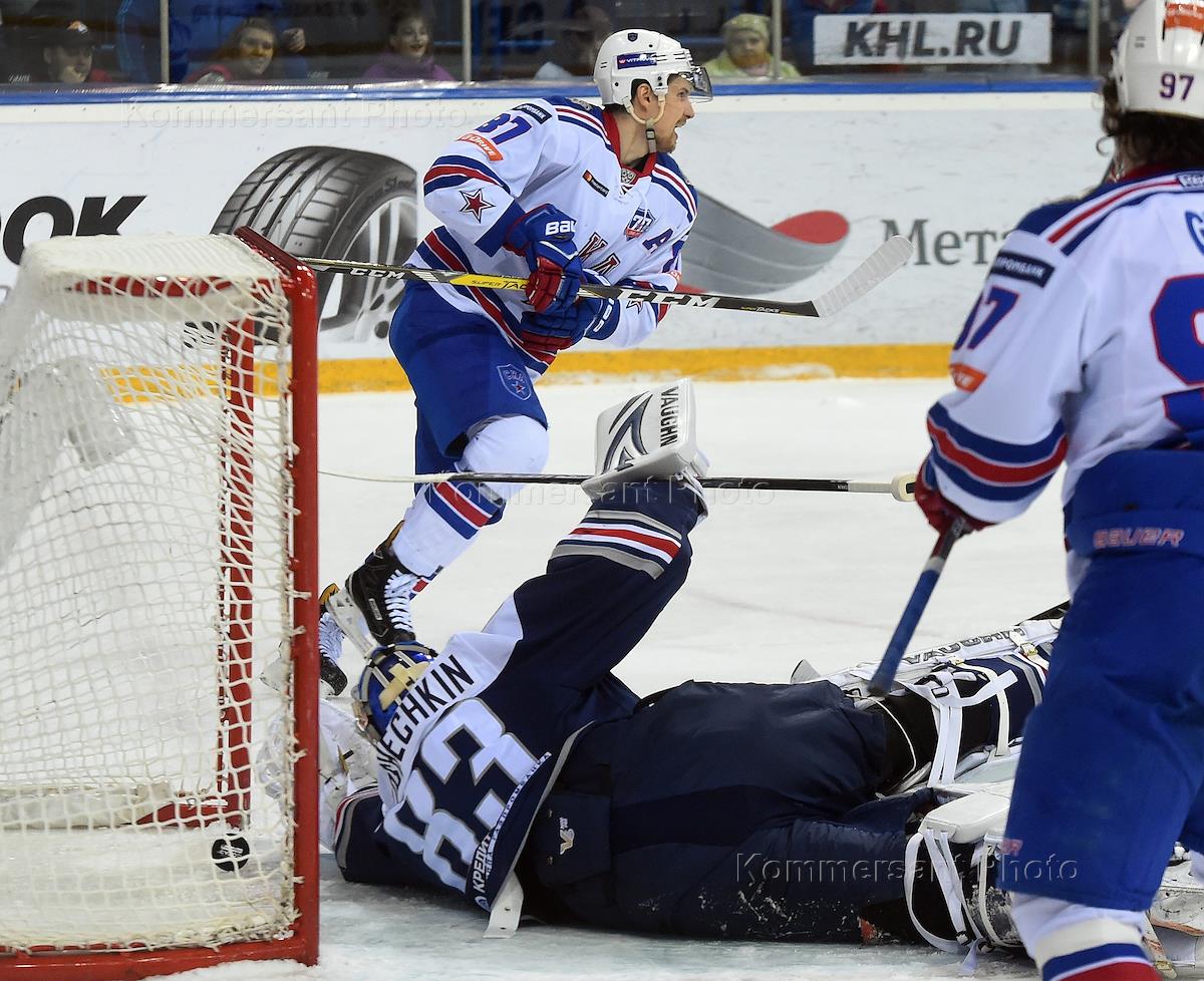 Континентальная хоккейная лига (КХЛ). Кубок Гагарина. Финал. Матч между командами "Металлург" (Магнитогорск) и СКА (Санкт-Петербург) на стадионе "Арена-Металлург". Игроки команды "Металлург" Крис Ли (в центре), Василий Кошечкин (справа) и игрок команды СКА Илья Ковальчук (слева) во время матча.