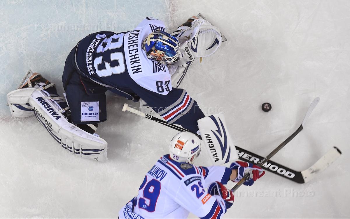 Континентальная хоккейная лига (КХЛ). Кубок Гагарина. Финал. Матч между командами "Металлург" (Магнитогорск) и СКА (Санкт-Петербург) на стадионе "Арена-Металлург". Игрок команды "Металлург" Василий Кошечкин (в центре) и игрок команды СКА Вадим Шипачев (слева) во время матча.
