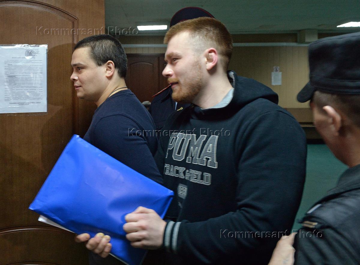 Обвиняемые в злоупотреблении полномочиями по делу о перестрелке у ресторана на Рочдельской улице оперуполномоченный отделения уголовного розыска Ильдар Шакиров (справа) и бывший участковый уполномоченный Ренат Зиннатулин (слева) перед началом судебного заседания в Пресненском районном суде.