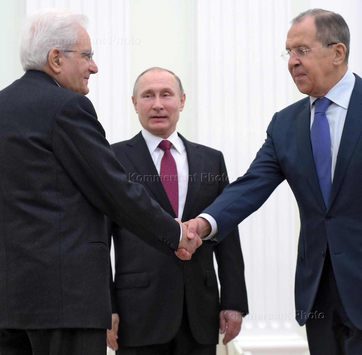 Президент России Владимир Путин (в центре), министр иностранных дел России Сергей Лавров (справа) и президент Италии Серджо Маттарелла (слева) во время встречи в Кремле.