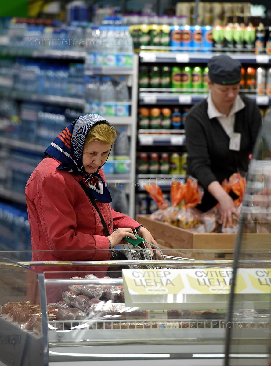 Супермаркет "Перекресток" в ТЦ "Океания" на Кутузовском проспекте. Покупательница у прилавка с консервированными продуктами.