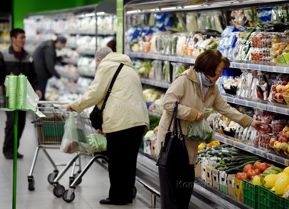 Супермаркет "Перекресток" в торговом центре "Океания" на Кутузовском проспекте. Покупатели в отделе "Овощи".