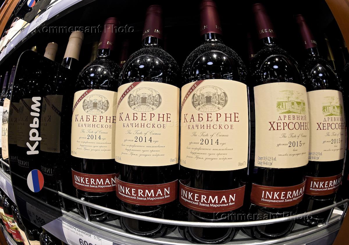Супермаркет "Перекресток" в торговом центре "Океания" на Кутузовском проспекте. Отдел "Алкоголь". Бутылки с вином из Крыма.