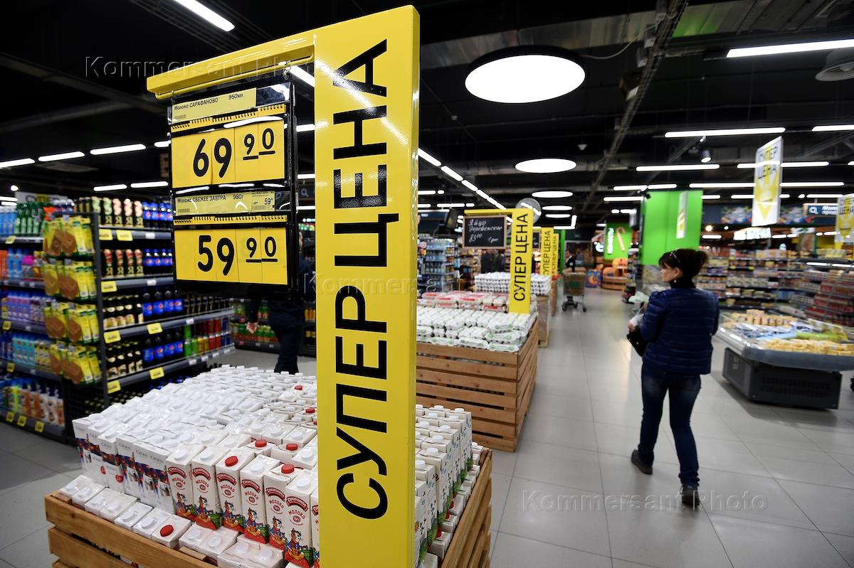 Супермаркет "Перекресток" в торговом центре "Океания" на Кутузовском проспекте. Покупатель в торговом зале. Табличка с надписью "Супер цена".