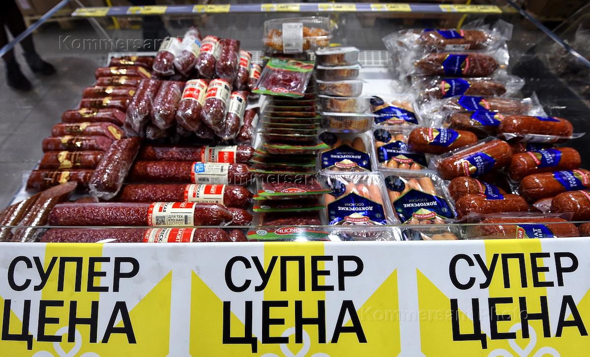 Супермаркет "Перекресток" в торговом центре "Океания" на Кутузовском проспекте. Продавец мясного отдела выкладывает товар на витрину.
