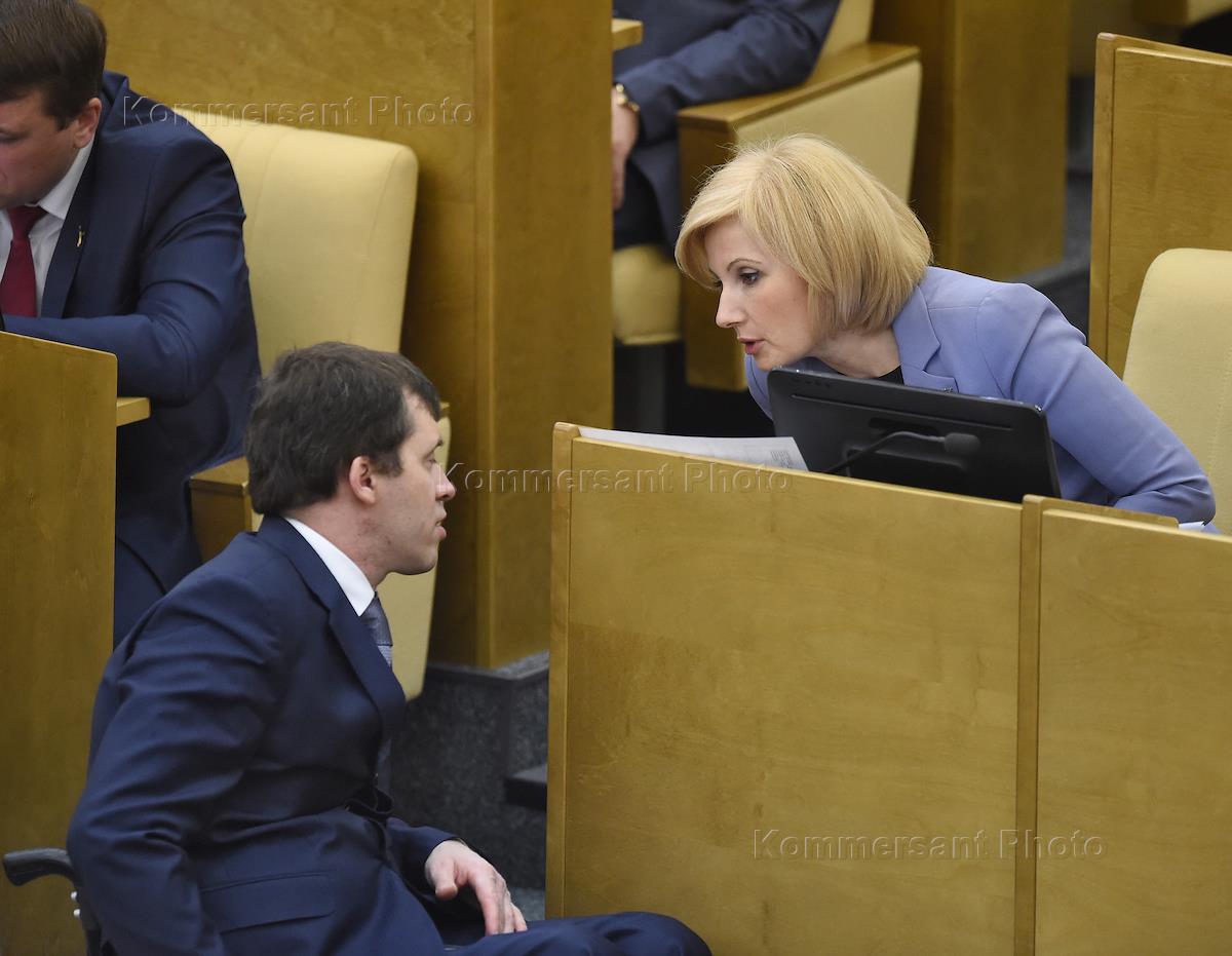 Пленарное заседание Государственной думы (ГД) России. Заместитель председателя комитета ГД России по труду, социальной политике и делам ветеранов Михаил Терентьев (слева) и член комитета ГД России по государственному строительству и законодательству Ольга Баталина (справа) во время заседания.