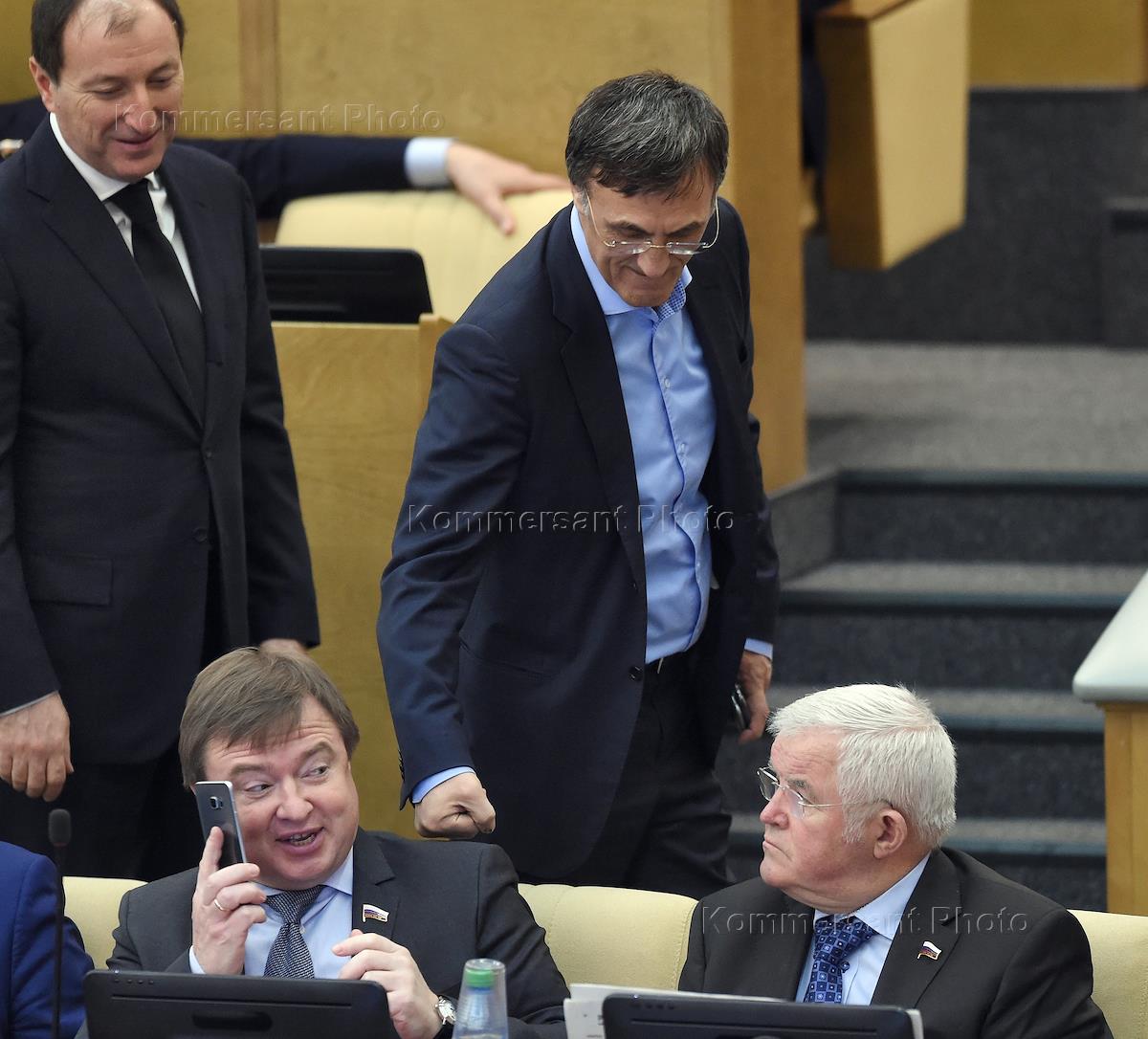 Пленарное заседание Государственной думы (ГД) России. Слева направо: заместитель председателя комитета ГД России по бюджету и налогам Леонид Симановский, член комитета ГД России по образованию и науке Алексей Загребин и член комитета ГД России по охране здоровья Владислав Третьяк во время заседания.