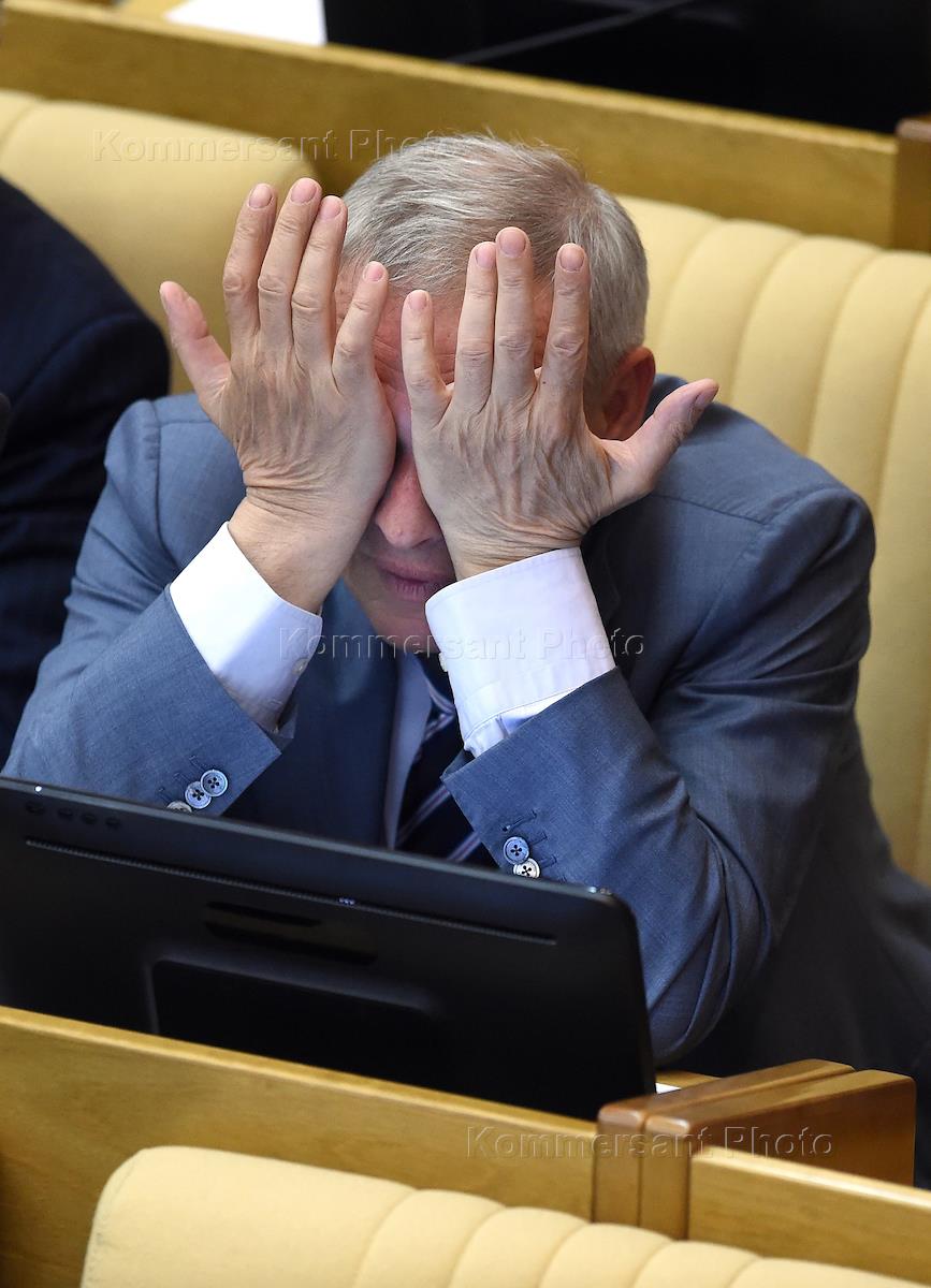 Пленарное заседание Государственной думы (ГД) России. Заместитель председателя комитета ГД России по делам Содружества Независимых Государств, евразийской интеграции и связям с соотечественниками Виктор Водолацкий во время заседания.