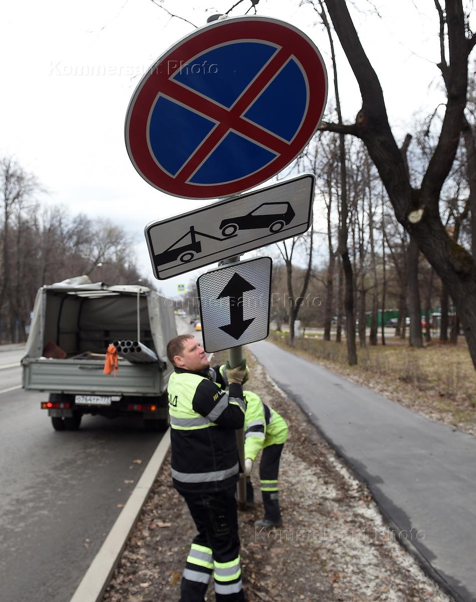Демонтаж дорожных знаков "Стоянка запрещена" и "Остановка запрещена" на Богородском шоссе в Сокольниках. Сотрудники Центра организации дорожного движения (ЦОДД) во время работ по установке новых знаков парковки.