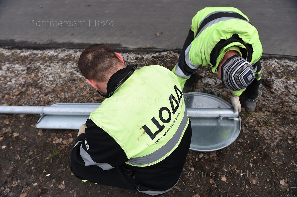 Демонтаж дорожных знаков "Стоянка запрещена" и "Остановка запрещена" на Богородском шоссе в Сокольниках. Сотрудники Центра организации дорожного движения (ЦОДД) во время работ по демонтажу дорожных знаков.