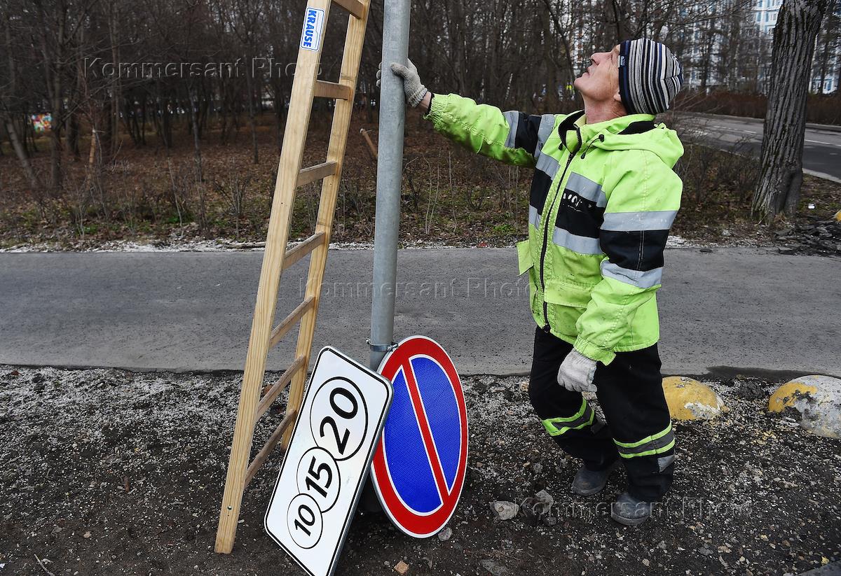 Демонтаж дорожных знаков "Стоянка запрещена" и "Остановка запрещена" на Богородском шоссе в Сокольниках. Сотрудники Центра организации дорожного движения (ЦОДД) во время работ по установке новых знаков парковки.