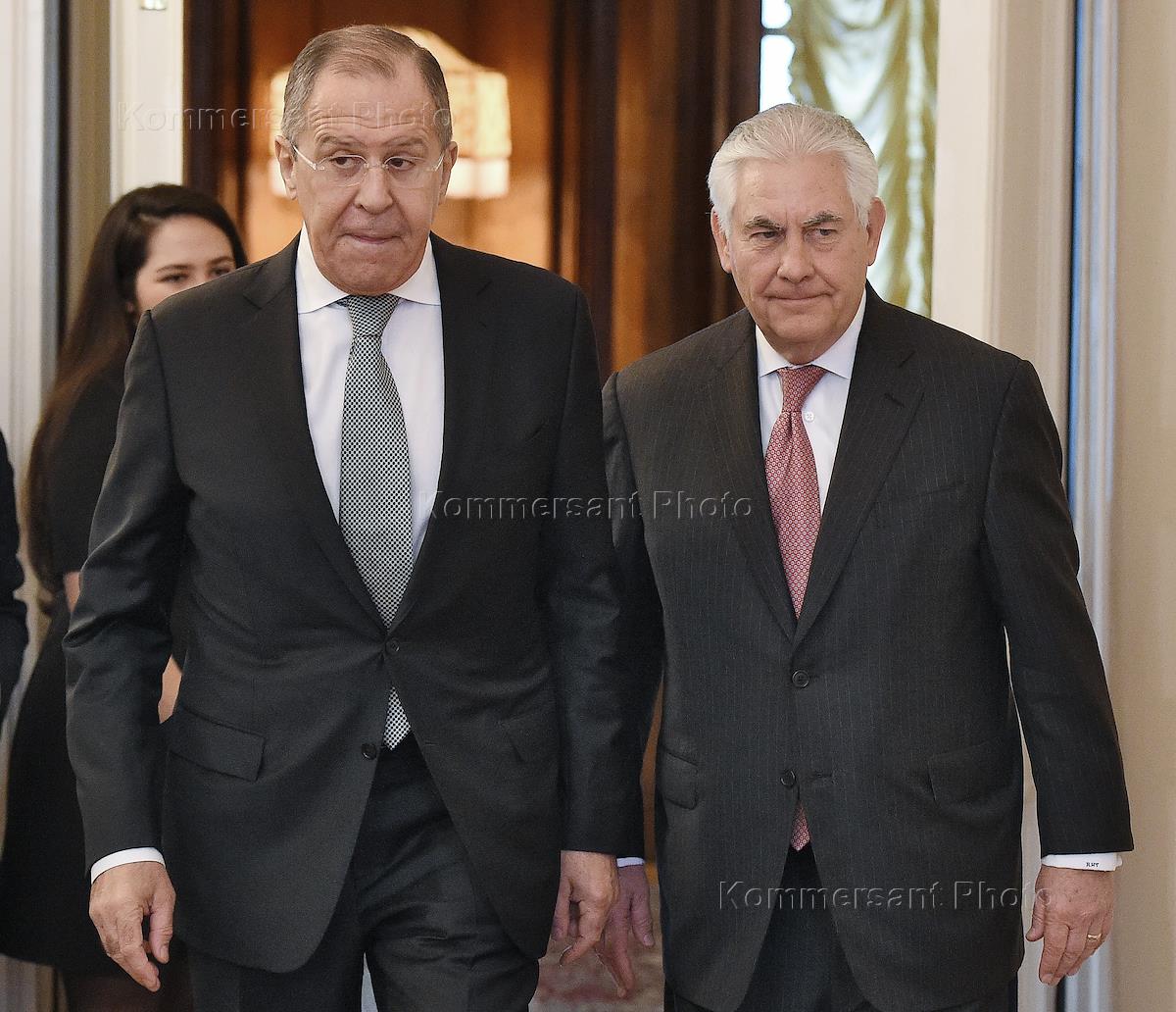 U.S. Secretary of State Rex Tillerson (right) and Russian Foreign Minister Sergey Lavrov (left) enter a hall during their talks.