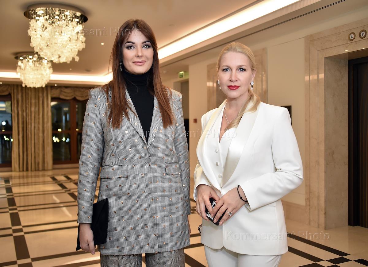 Показ коллекции одежды модного дома Natalia Gart, дизайнера Натальи Гарт, в зале "Чайковский" отеля Four Seasons. Супруга олимпийского чемпиона по спортивной гимнастике Алексея Немова Галина (слева) и телеведущая Елена Старостина (в центре) перед началом показа.