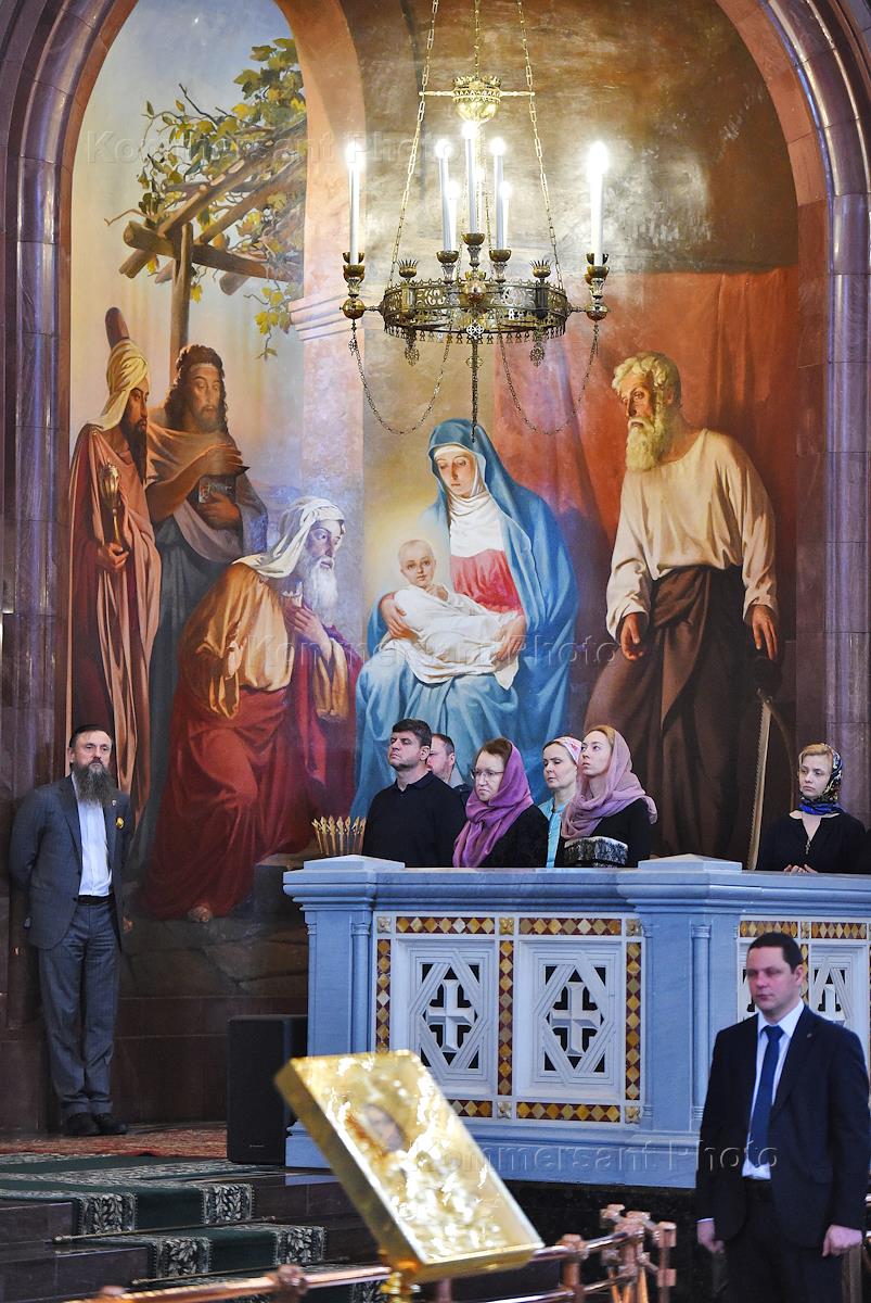 Верующие во время богослужения в Великий четверг в храме Христа Спасителя.