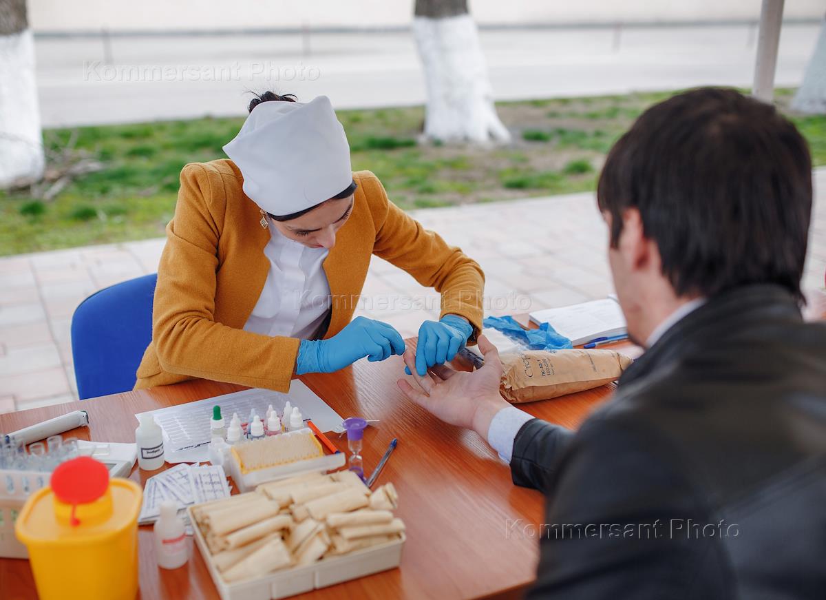 Всекавказская донорская эстафета "От сердца к сердцу", прошедшая во Всемирный День здоровья. Мужчина во время сдачи анализа на группу крови.