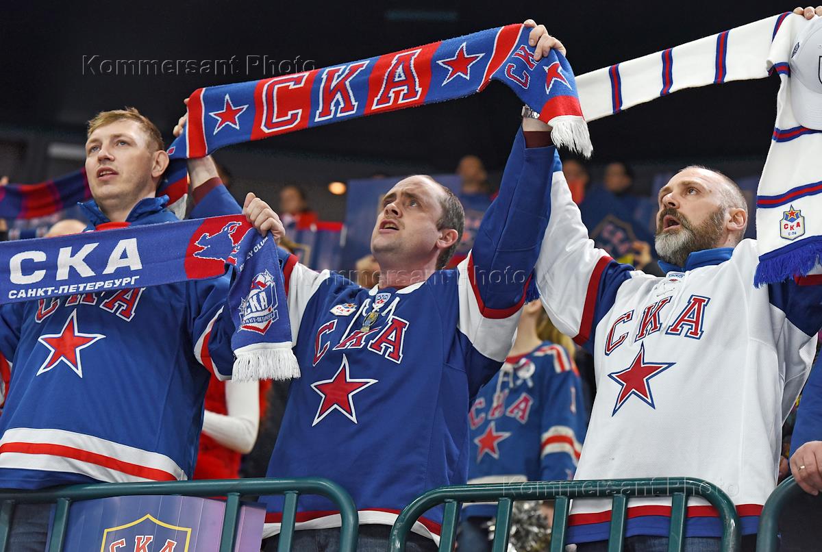 Чемпионат КХЛ по хоккею с шайбой. Финал плей-офф Кубка Гагарина между командами СКА (Санкт-Петербург) и "Металлург" (Магнитогорск). Болельщики СКА во время матча.