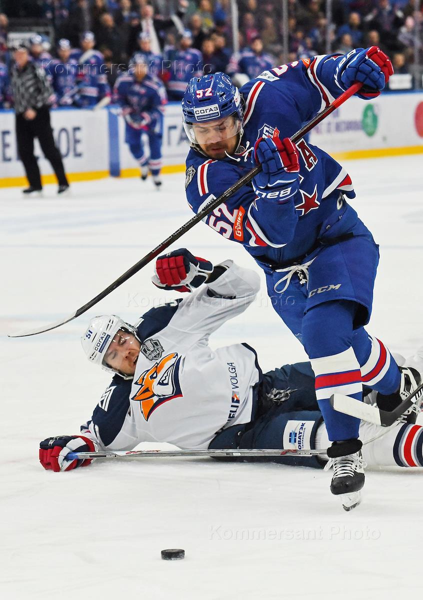 Чемпионат КХЛ по хоккею с шайбой. Финал плей-офф Кубка Гагарина между командами СКА (Санкт-Петербург) и "Металлург" (Магнитогорск). Игрок СКА Никита Гусев (слева) и игрок "Металлурга" Ярослав Хабаров (справа) во время матча.