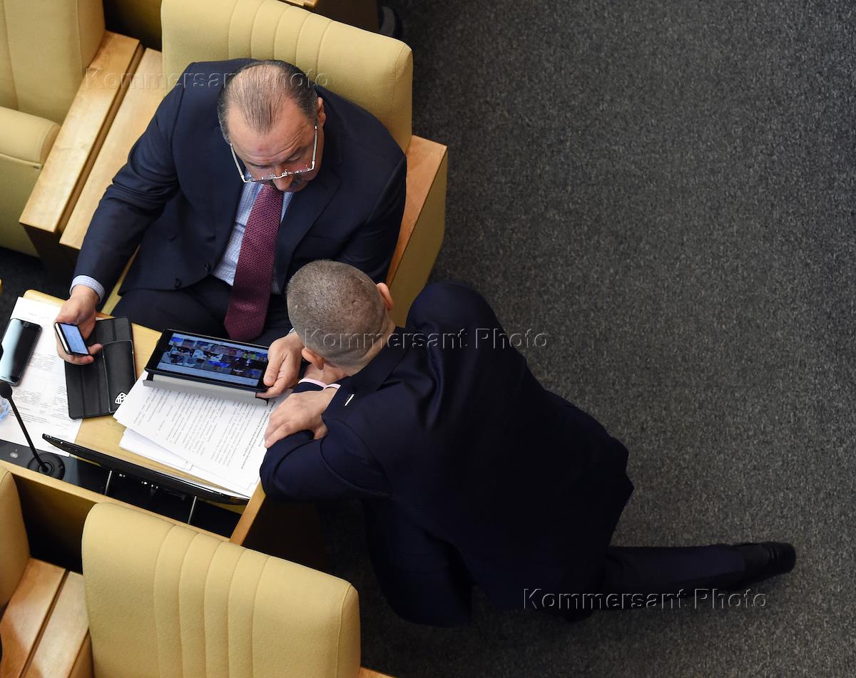Пленарное заседание Государственной думы (ГД) России. Член Комитета ГД по информационной политике, информационным технологиям и связи Вадим Деньгин (слева) перед началом заседания.