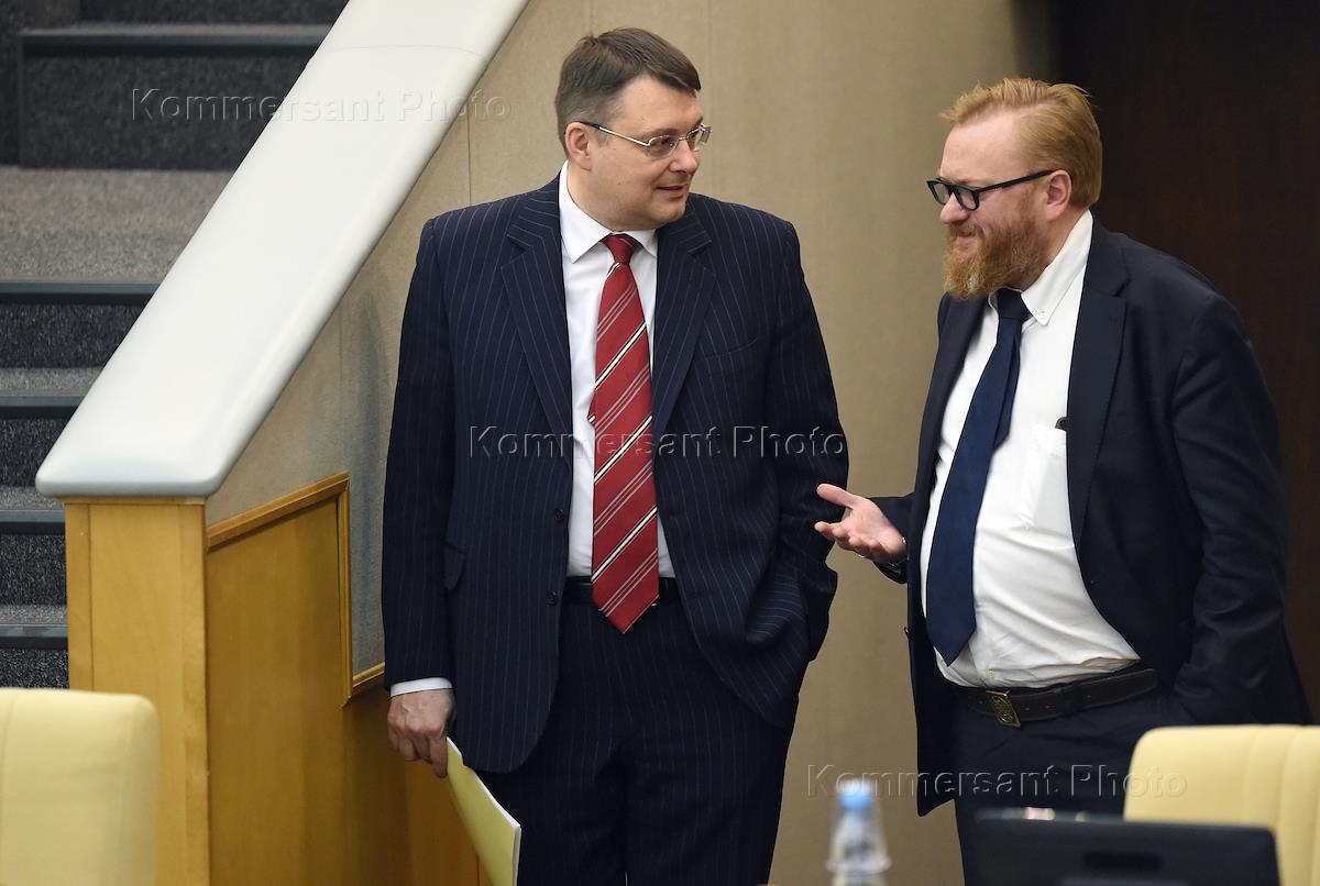 Пленарное заседание Государственной думы (ГД) России. Член комитета Государственной Думы России по международным делам Виталий Милонов (слева) перед началом заседания.