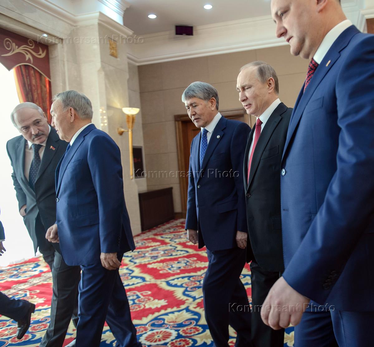 L-R: Belarus' President Alexander Lukashenko, Kazakhstan's President Nursultan Nazarbayev, Kyrgyzstan's President Almazbek Atambayev, Russian President Vladimir Putin and Moldovan President Igor Dodon walk as they attend a Supreme Eurasian Economic Council (SEEC).